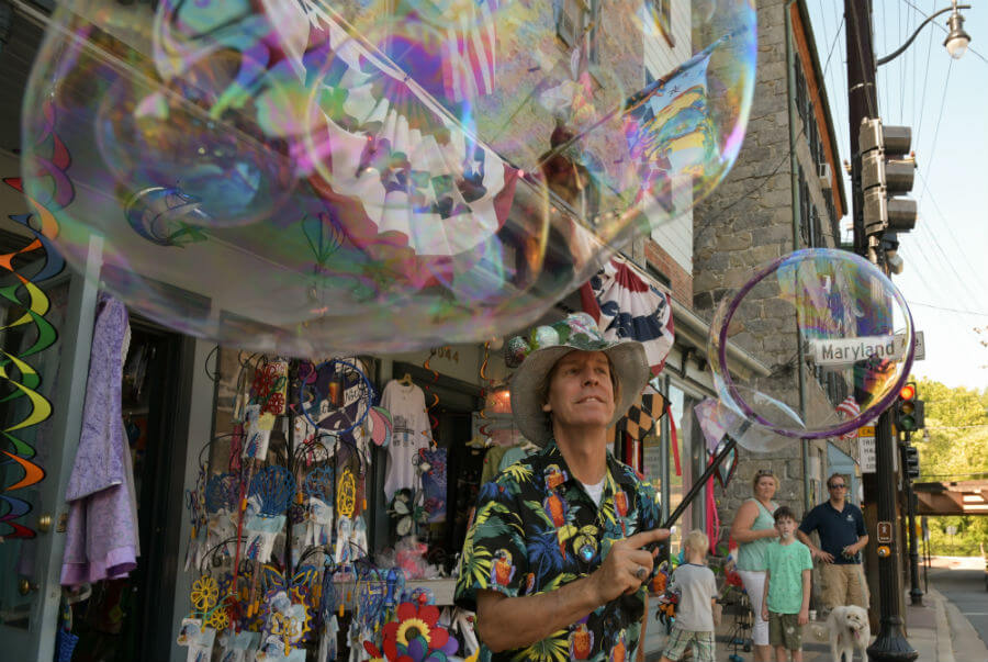 Barry Gibson, also known at the "Bubbleman," entertains passersby on Main Street in Ellicott City July 30, as the town marks the one-year anniversary of the historic floods. St. Paul Church hosted an ecumenical prayer service earlier in the day that included worshipers and faith-leaders from 12 Howard County congregations. (Kevin J. Parks/CR Staff)Read More