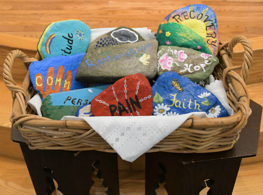 Emotions felt by area residents and business owners are painted on rocks from the Patapsco River, and placed in a basket at the foot of the altar during an ecumenical prayer service St. Paul Church July 30. The town is marking the one-year anniversary of the historic Ellicott City floods. (Kevin J. Parks/CR Staff)Read More