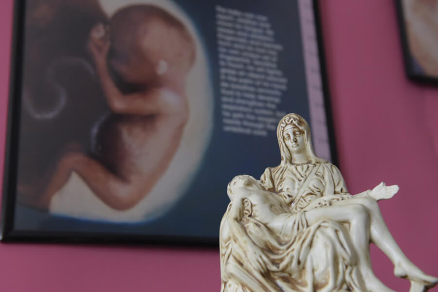 A poster of a developing fetus is the backdrop for a statue of the Pieta at West Baltimore Pregnancy Choices, which offers a place of prayer and alternatives to abortion. (Kevin J. Parks/CR Staff)Read More