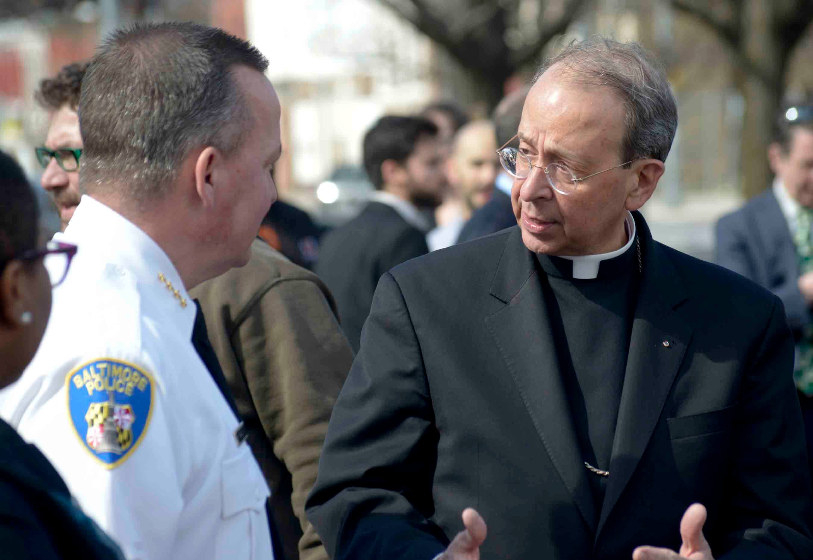 Archbishop William E. Lori speaks with Baltimore City Police Commissioner Kevin Davis at the March 2016 launch of the Safe Streets program. (Kevin J. Parks/CR Staff)Read More
