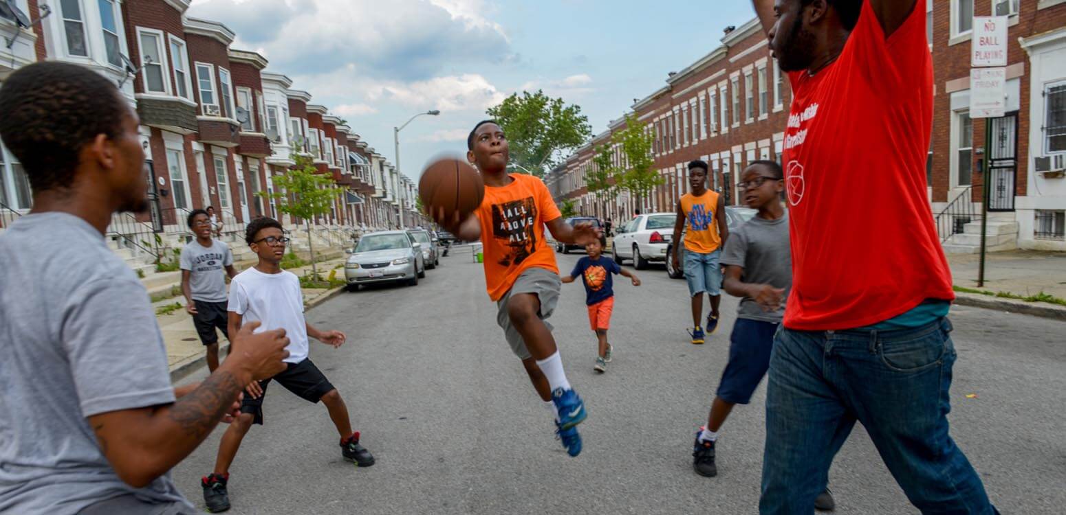 Playing against children twice his size, 12-year-old Robert Hall makes his move toward the bucket during a pickup basketball game at the 2nd annual Dare to Care interfaith summer camp on Harlem Avenue in West Baltimore June 30. St. Edward Church was one of several area churches, ministries, and community groups hosting the event. (Kevin...Read More