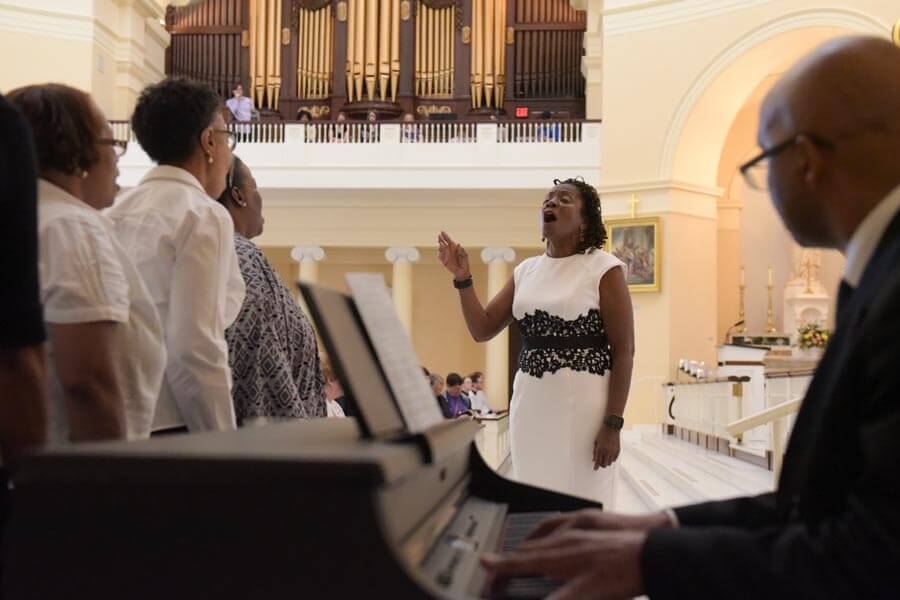 Gladys Johnson and Orrin Bynum lead the choir from St. Ambrose Church in Park Heights during a Mass celebrating the 50th anniversary of the priestly ordination of Auxiliary Bishop Emeritus of Baltimore, Denis J. Madden, at the Basilica of the National Shrine of the Assumption of the Blessed Virgin Mary in Baltimore June 25. (Kevin...Read More