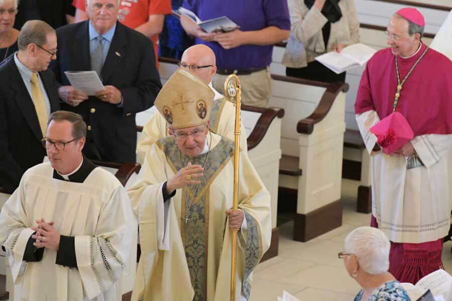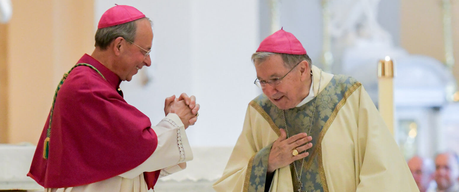 Auxiliary Bishop Emeritus of Baltimore, Denis J. Madden, humbly accepts the gratitude of Archbishop William E. Lori during a Mass celebrating the 50th anniversary of his priestly ordination at the Basilica of the National Shrine of the Assumption of the Blessed Virgin Mary in Baltimore June 25. (Kevin J. Parks/CR Staff)Read More