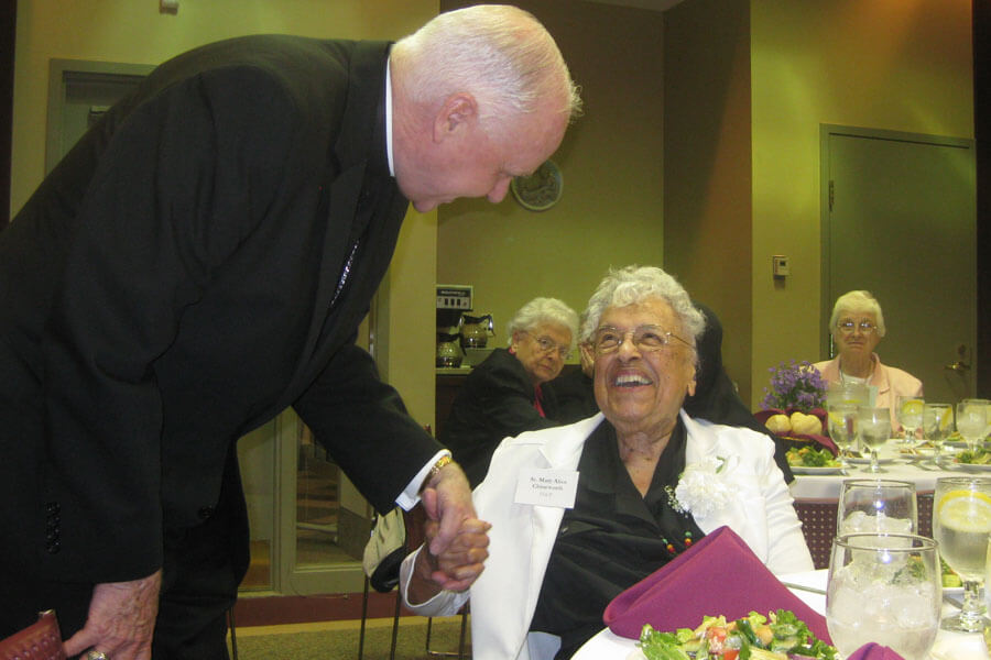 At a 2008 dinner honoring religious women and men celebrating jubilee anniversaries, then-Archbishop Edwin F. O’Brien greets Oblate Sister of Providence Mary Alice Chineworth. (CR file)Read More
