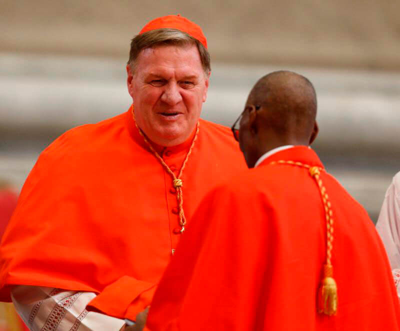 Cardinal Joseph W. Tobin of Newark, N.J., greets Cardinal-designate Jean Zerbo of Bamako, Mali, before Pope Francis arrives to lead a consistory in St. Peter's Basilica at the Vatican June 28. The African prelate was among five new cardinals created by Pope Francis during the consistory. (CNS photo/Paul Haring)Read More
