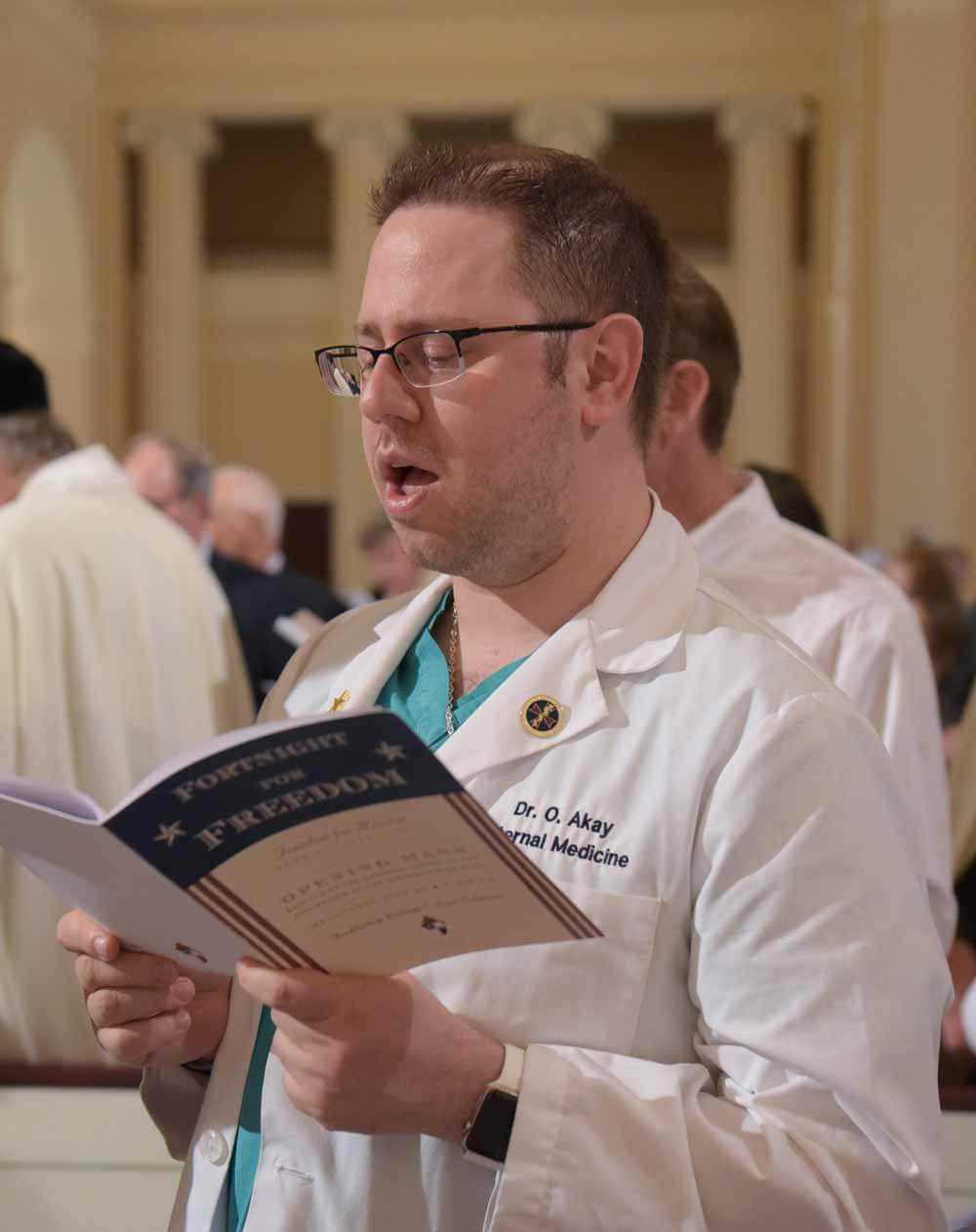 Physician and Catholic Health Association member, Okan Akay, sings during the opening Mass for the Fortnight for Freedom June 21. (Kevin J. Parks/CR Staff)Read More