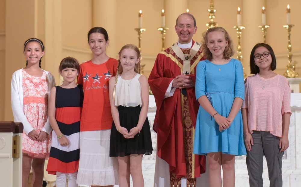 Archbishop William E. Lori congratulates Freedom for Mission essay contest winners AnneMarie Gallo, Catherine Freymann, Abigail Freymann, Irie Wolfe, Emma Faraone and Madison Villarba at the Fortnight for Freedom Mass June 21. (Kevin J. Parks/CR Staff)Read More