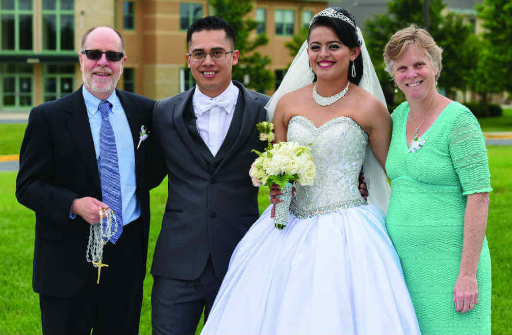 Deacon Scott Rose, left, and his wife, Mary Austin, right, played a pivotal role in Silvia Herrera being able to remain in the United States after she fled El Salvador. They are shown after her May 20 wedding to Nain Martinez at St. Katharine Drexel in Frederick. (Kevin J. Parks/CR Staff)Read More
