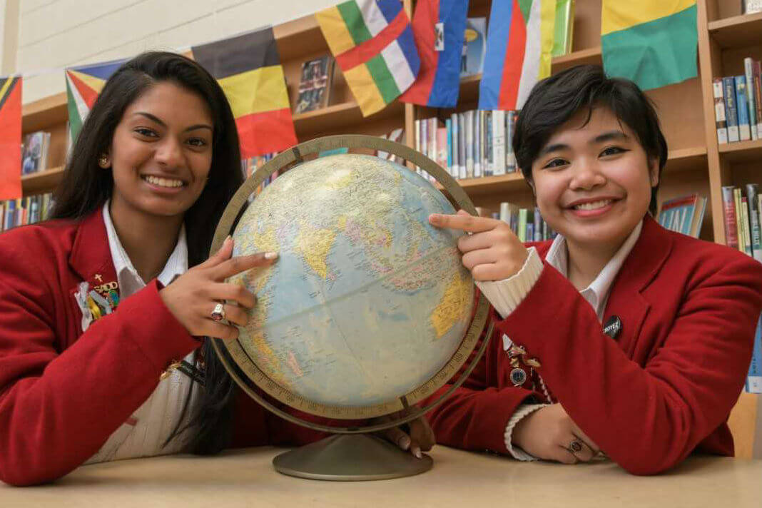 Members of the class of 2017 at Mercy High School, Catherine Zuzarte, left, and Christine Joy Escobar, point to their family origins of Pakistan and the Philippines, respectively, on a globe in the school’s library. Both were archdiocesan Distinctive Scholars. (Kevin J. Parks/CR Staff)Read More