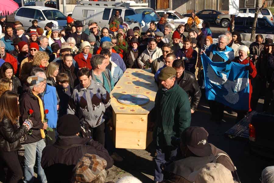 Pallbearers carry the coffin of Philip Berrigan up the steps into St. Peter Claver Church in West Baltimore Dec. 9. (Owen Sweeney III/CR Staff)Read More