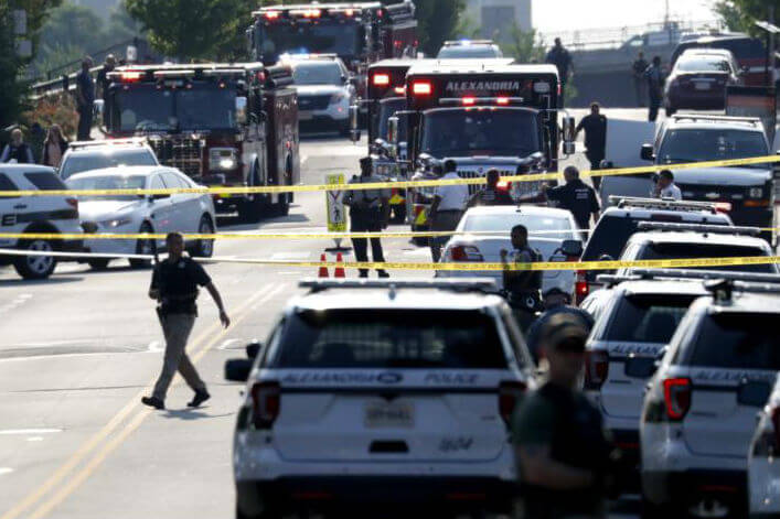 First responders are seen early June 14 after U.S. House Majority Whip Steve Scalise, R-La., was shot while practicing baseball, according to news reports. Multiple reports said two U.S. Capitol Police officers who were part of the Catholic congressman's protective detail also were shot. (CNS photo/Shawn Thew, EPA)Read More