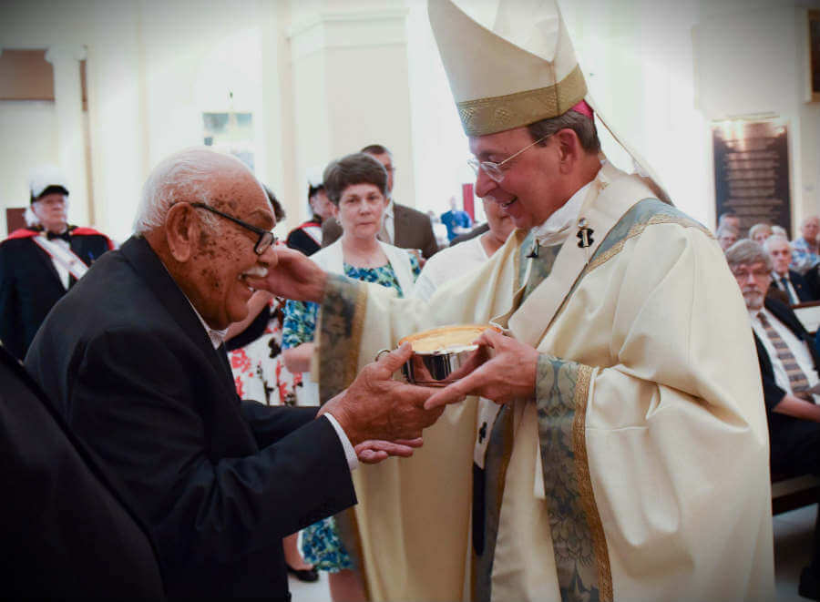 Secundino Jusino, grandfather to Deacon John Martinez, presents the gifts to Archbishop Lori. (Photo by Richard Lippenholz | Special to the Catholic Review)Read More