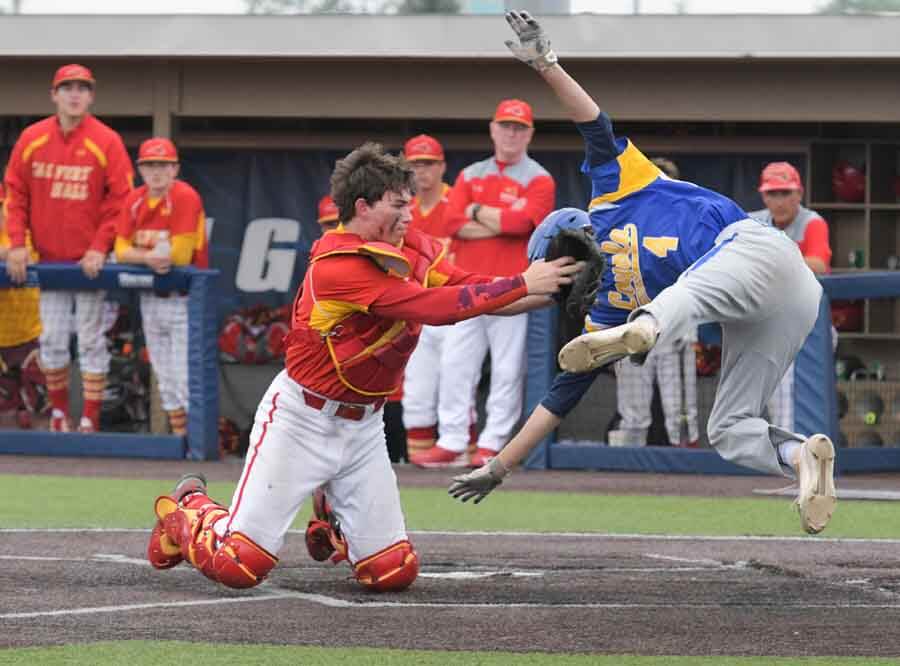 Calvert Hall catcher Garrett Matheny tags an acrobatic Jack Reinhardt during the MIAA A Conference championship game between the Cardinals and Loyola Dons at Harford Community College May 22. The Dons defeated the Cardinals 8-3 for their first championship since 1946. (Kevin J. Parks/ CR Staff)Read More