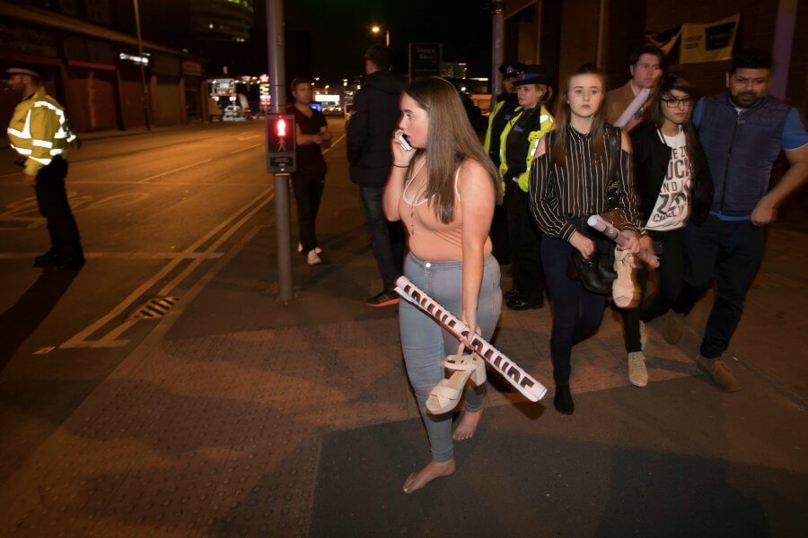 Concertgoers react after fleeing Manchester Arena in England where U.S. singer Ariana Grande had been performing May 22. At least 22 people, including children, were killed and dozens wounded after an explosion at the concert venue. Authorities said it was Britain's deadliest case of terrorism since 2005. (CNS photo/Jon Super, Reuters)Read More