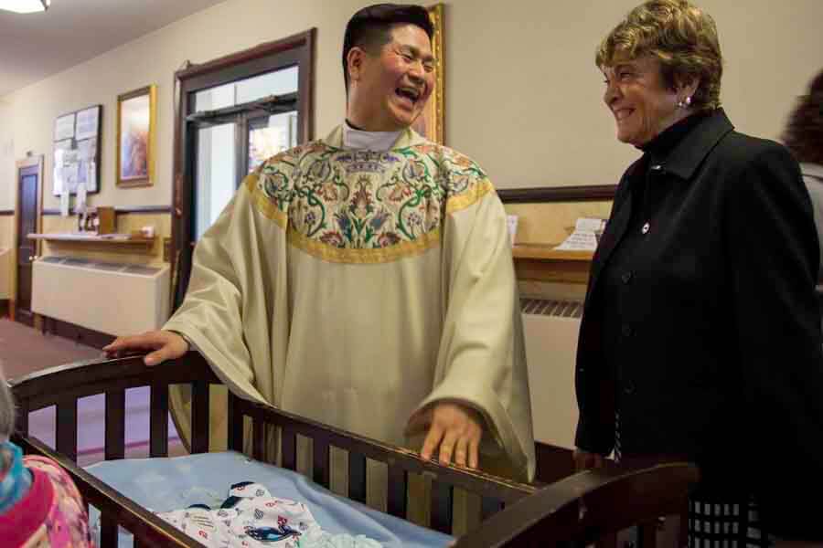 Father Sylvester Kim, pastor of St. Thomas Aquinas, shares a laugh with a parishioner where the parish collects donations for the Center for Pregnancy Concerns. (Olivia Obineme/Special to the Review)Read More