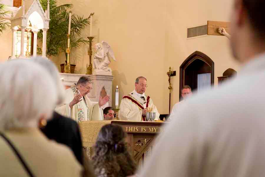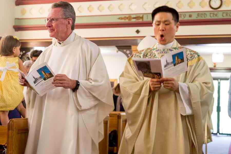 Father James Farmer and Father Sylvester Kim sing at the 150 anniversary Mass for St. Thomas Aquinas in Hampden May 14. (Olivia Obineme/Special to the Review)Read More