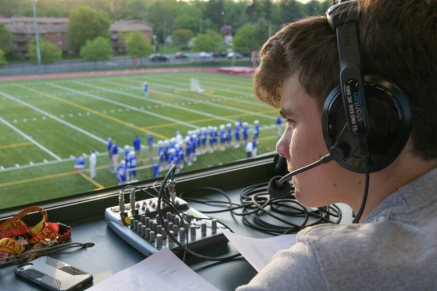 Sophomore Brady Organt provides color commentary during a livestream webcast of a varsity lacrosse game against St. Mary’s High School April 28 from Calvert Hall College High School’s Paul Angelo Russo Stadium. (Kevin J. Parks/CR Staff)Read More