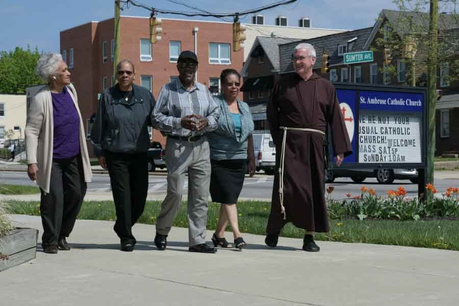 Capuchin Franciscan Father Paul Zaborowski, pastor of St. Ambrose Church, Park Heights, strolls around the front of church with Paula Cullings, Clinton Jiggetts and his wife Gloria, and Muriel Rice, following an evangelization meeting in the parish office April 20. (Kevin J. Parks/CR Staff)Read More