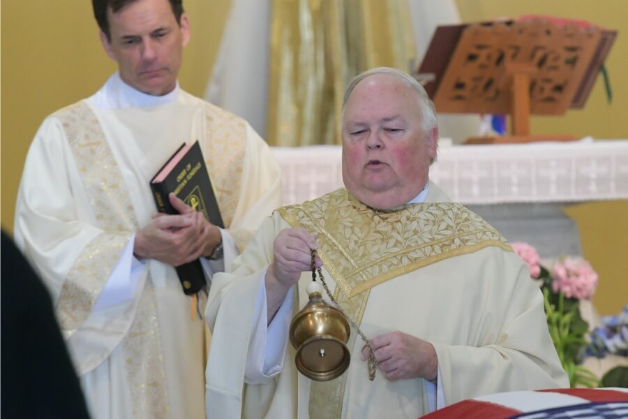 Flanked by Deacon Ray Van Pelt, Father John “Jack” Ward, pastor of St. Francis de Sales, uses incense to bless the body of U.S. Army Staff Sgt. Mark Rochetto de Alencar May 9. (Kevin J. Parks/CR Staff)Read More