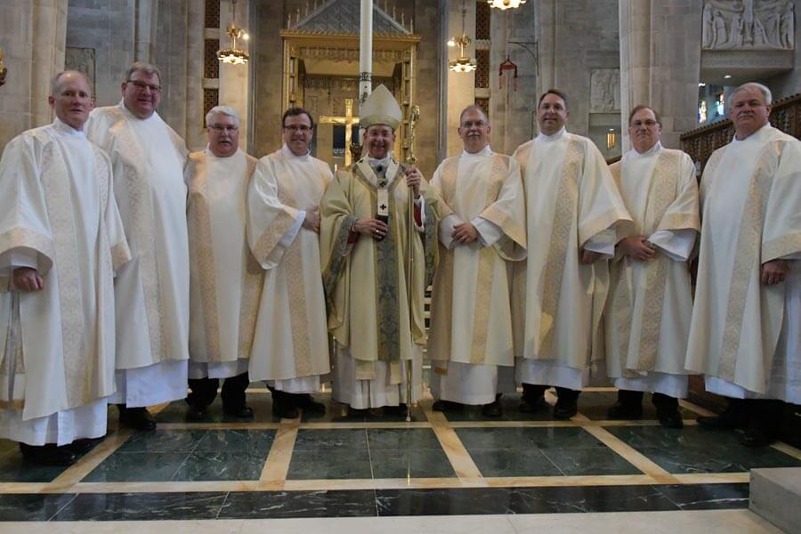 Archbishop William E. Lori stands with eight newly ordained permanent deacons Frank Hayden III, left, Philip Czajkowski, Joseph Wolf, Mark Cohagan, Scott Anderson, Kevin Hostutler, Bruce Hultquist and Timothy Mikules following their ordination Mass at the Cathedral of Mary Our Queen May 6. (Kevin J. Parks/CR Staff)Read More
