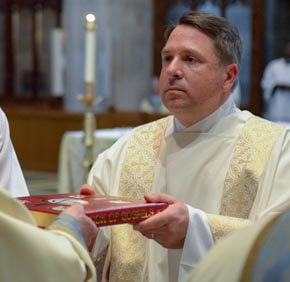 Archbishop William E. Lori hands the Book of the Gospels to Kevin Hostutler during the ordination of eight men to the permanent diaconate at the Cathedral of Mary Our Queen May 6. (Kevin J. Parks/CR Staff)Read More