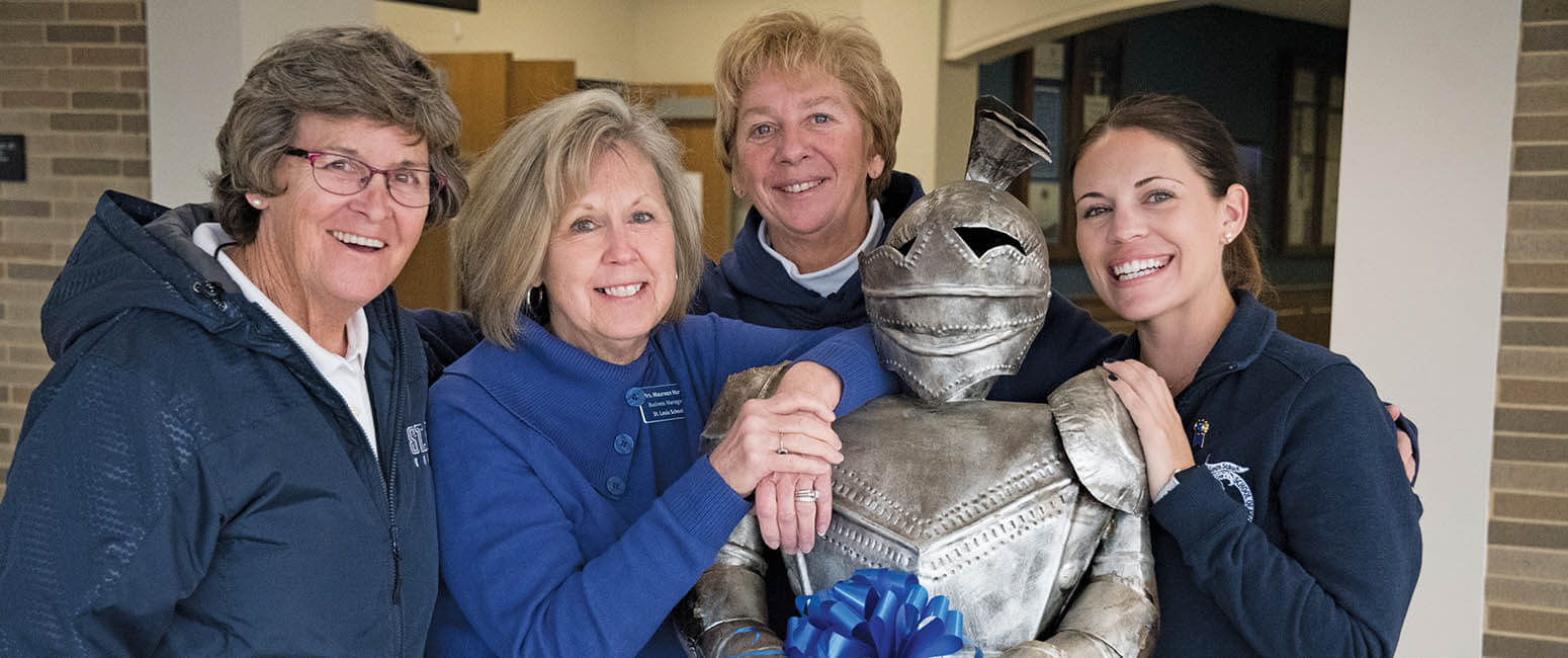 Alumnae-turned- staff-members Liz Brigham, class of 1960; business manager Maureen Hurst, ’69; Kathleen Hrinkevich, ’77; and Michelle Kemp, ’99, pose with Knight, the mascot of St. Louis School. (Kevin J. Parks/CR Staff)